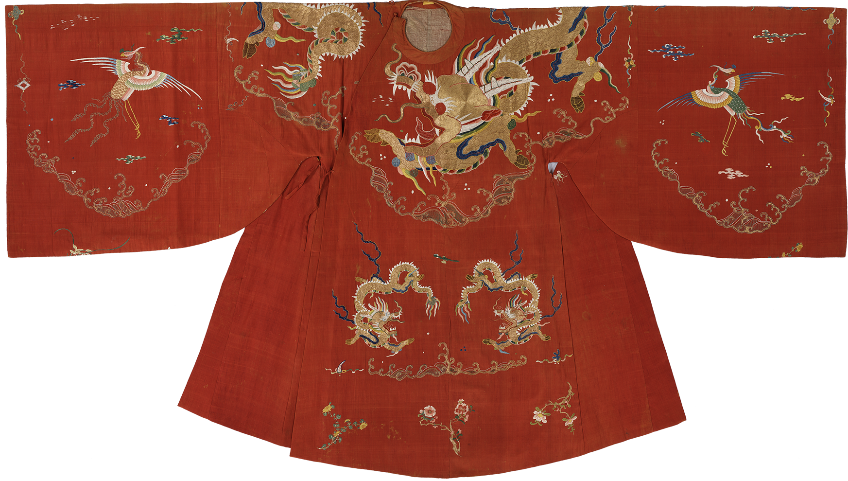 大红色绸绣过肩麒麟鸾凤纹女袍 明 山东博物馆藏
