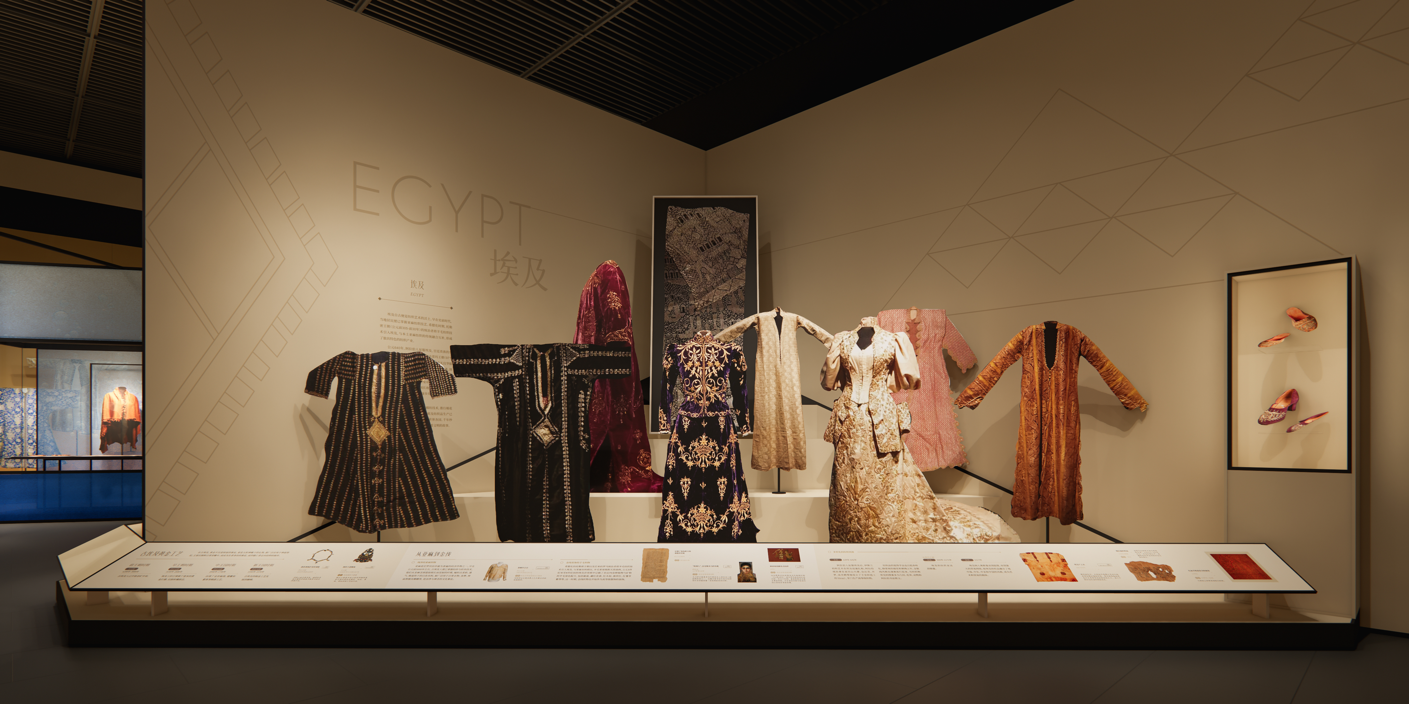 当从“日落之地”马格里布到埃及尼罗河畔的瑰宝跨千山万海而来,在本次展览中,观众将看到非洲马格里布的卡夫坦长袍镶金嵌玉,华美无匹;尼罗河畔的埃及婚服与穆勒鞋上,金线织就永生之梦;拜占庭王朝以紫螺染就紫色丝绸,以金线彰显崇高王权;阿拉伯人用金线演绎《一千零一夜》的绮梦,升起永不陨落的新月;波斯帝国的锦缎上金色的生命树生机勃勃,循环永恒;“衣冠王国”中国更以神乎其技的织锦、刺绣工艺,将丝绸与加金纺织工艺结合,展现出华美的东方气韵。